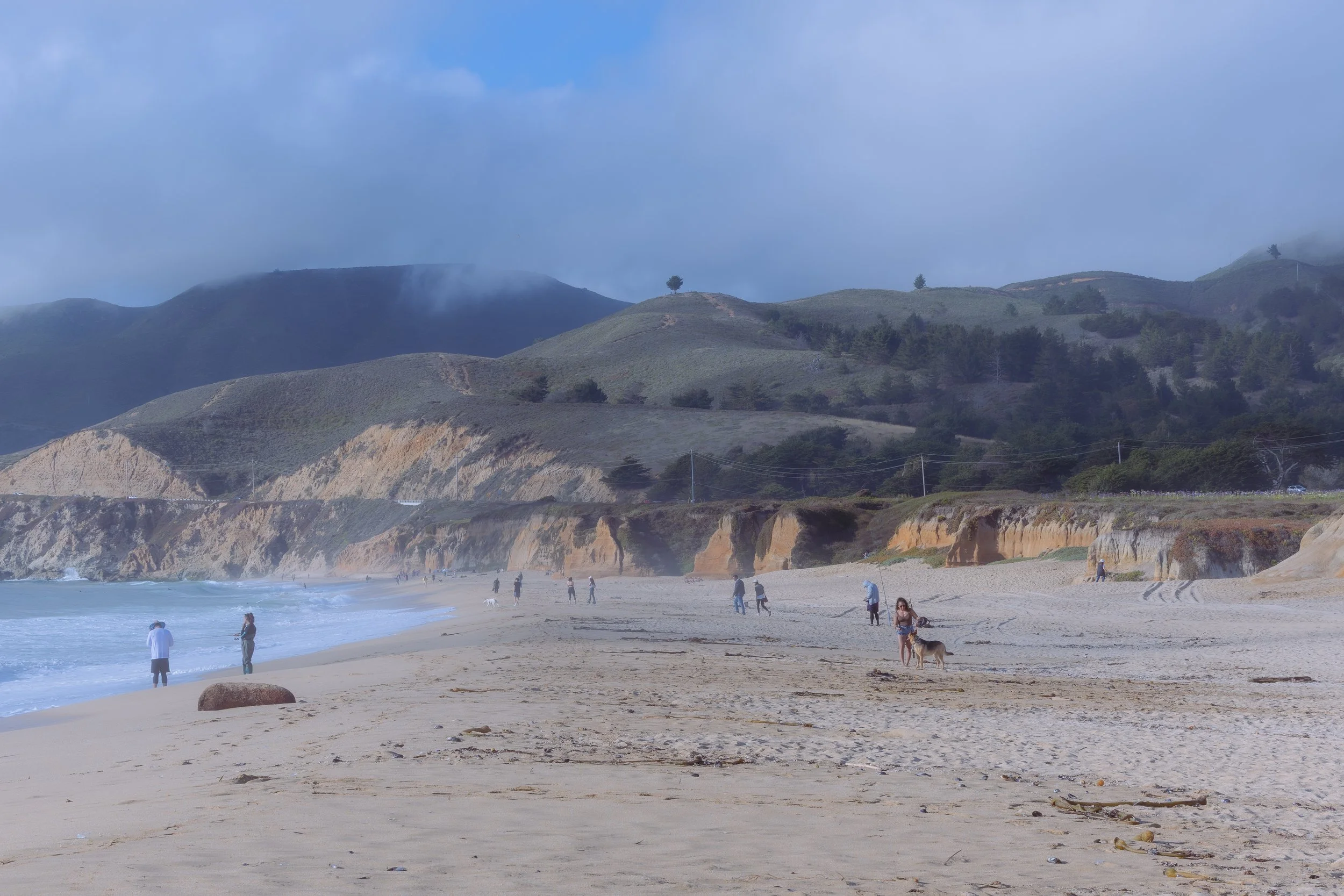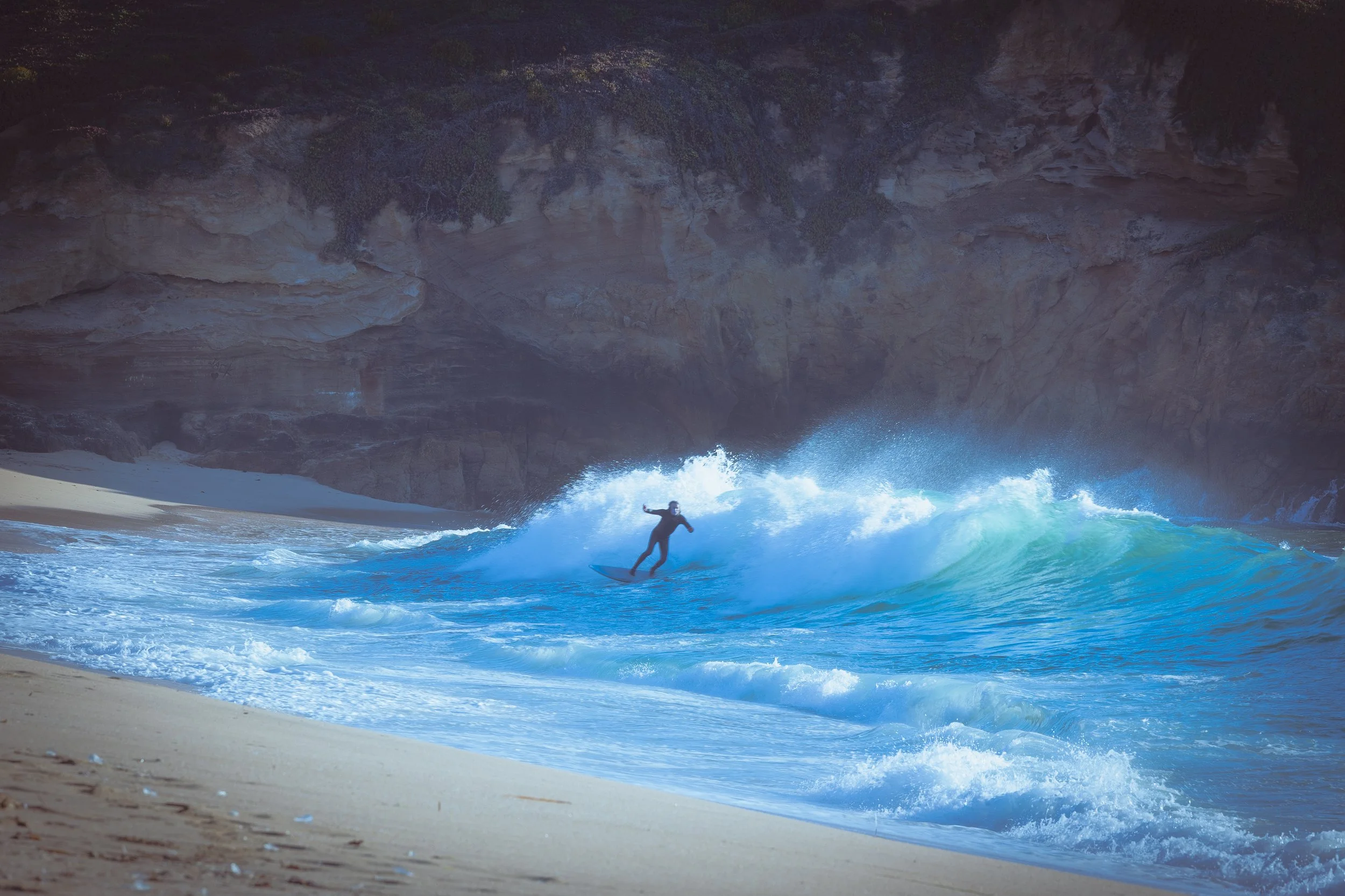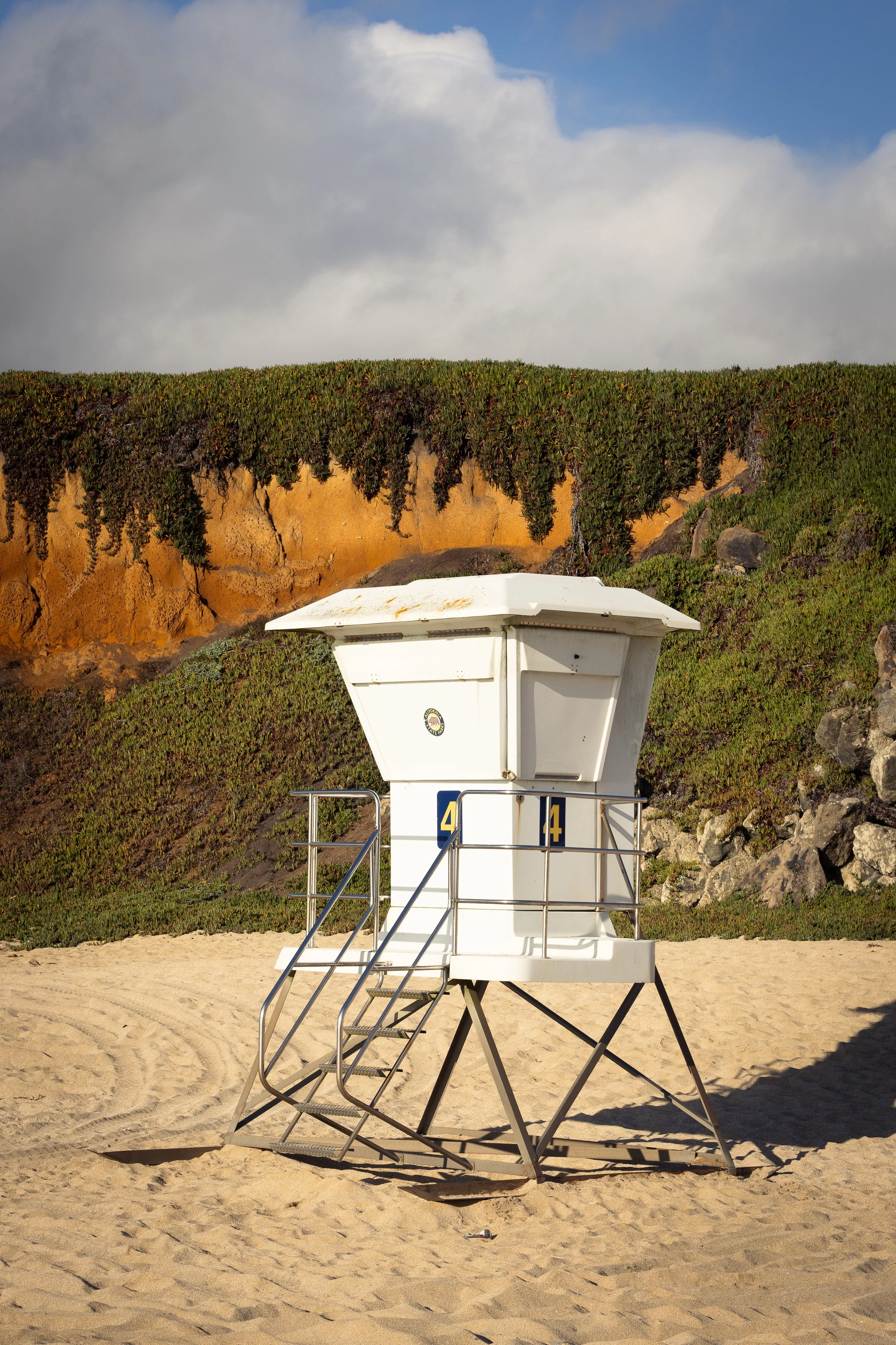A study of the rugged Northern California coast at Montara State Beach. The set captures the dramatic interplay between the eroded, golden cliffs and the rolling marine layer, featuring moments of solitude from a shoreline fisherman, a surfer in the break, and the stoic profile of Lifeguard Tower 4.