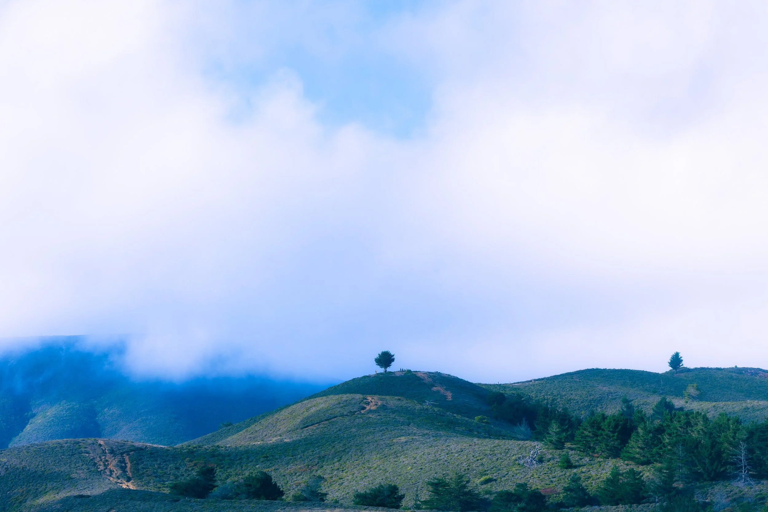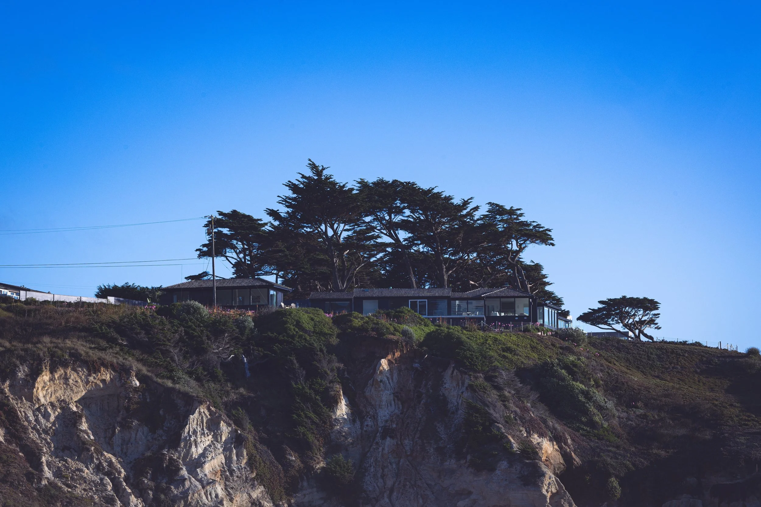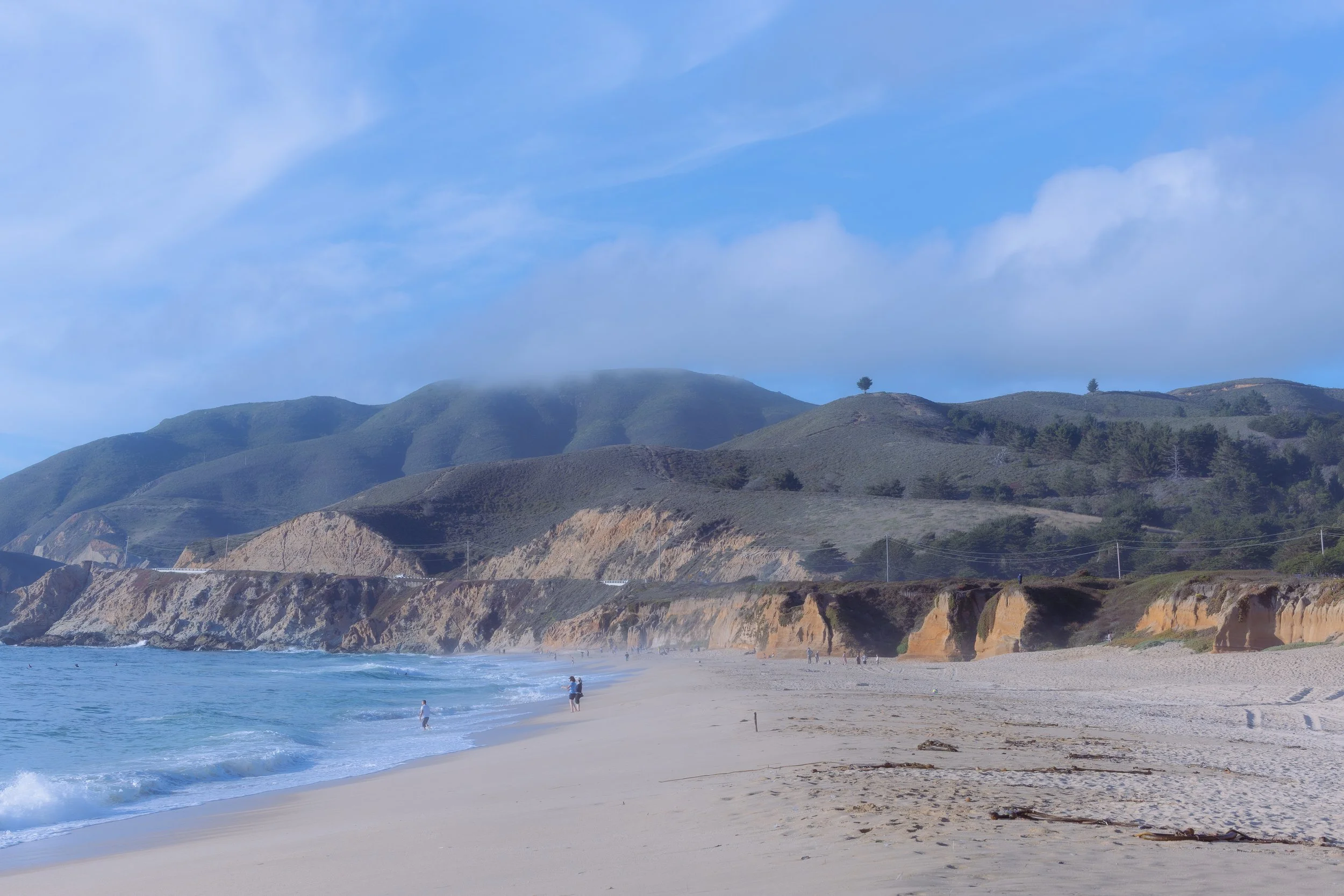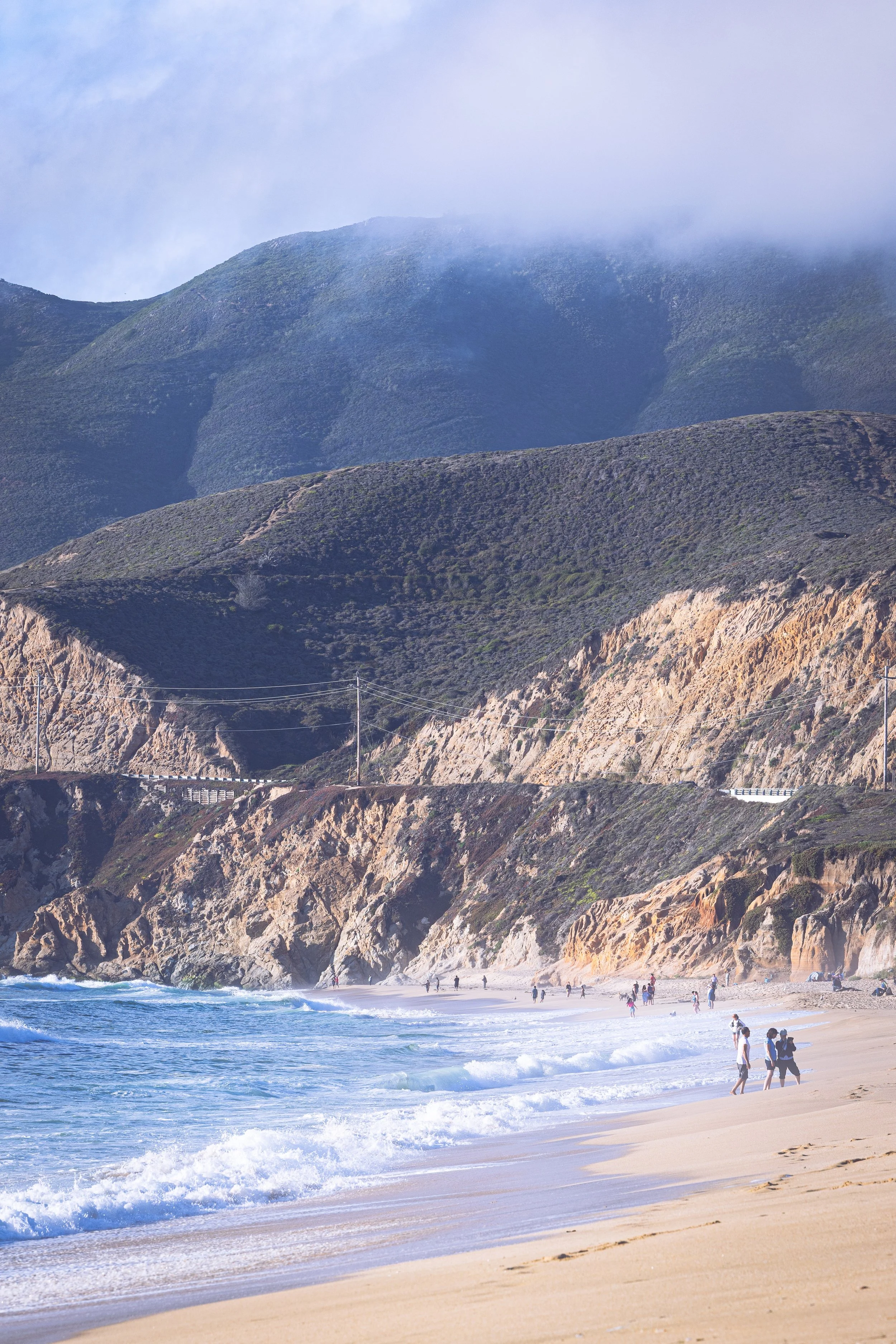 A study of the rugged Northern California coast at Montara State Beach. The set captures the dramatic interplay between the eroded, golden cliffs and the rolling marine layer, featuring moments of solitude from a shoreline fisherman, a surfer in the break, and the stoic profile of Lifeguard Tower 4.