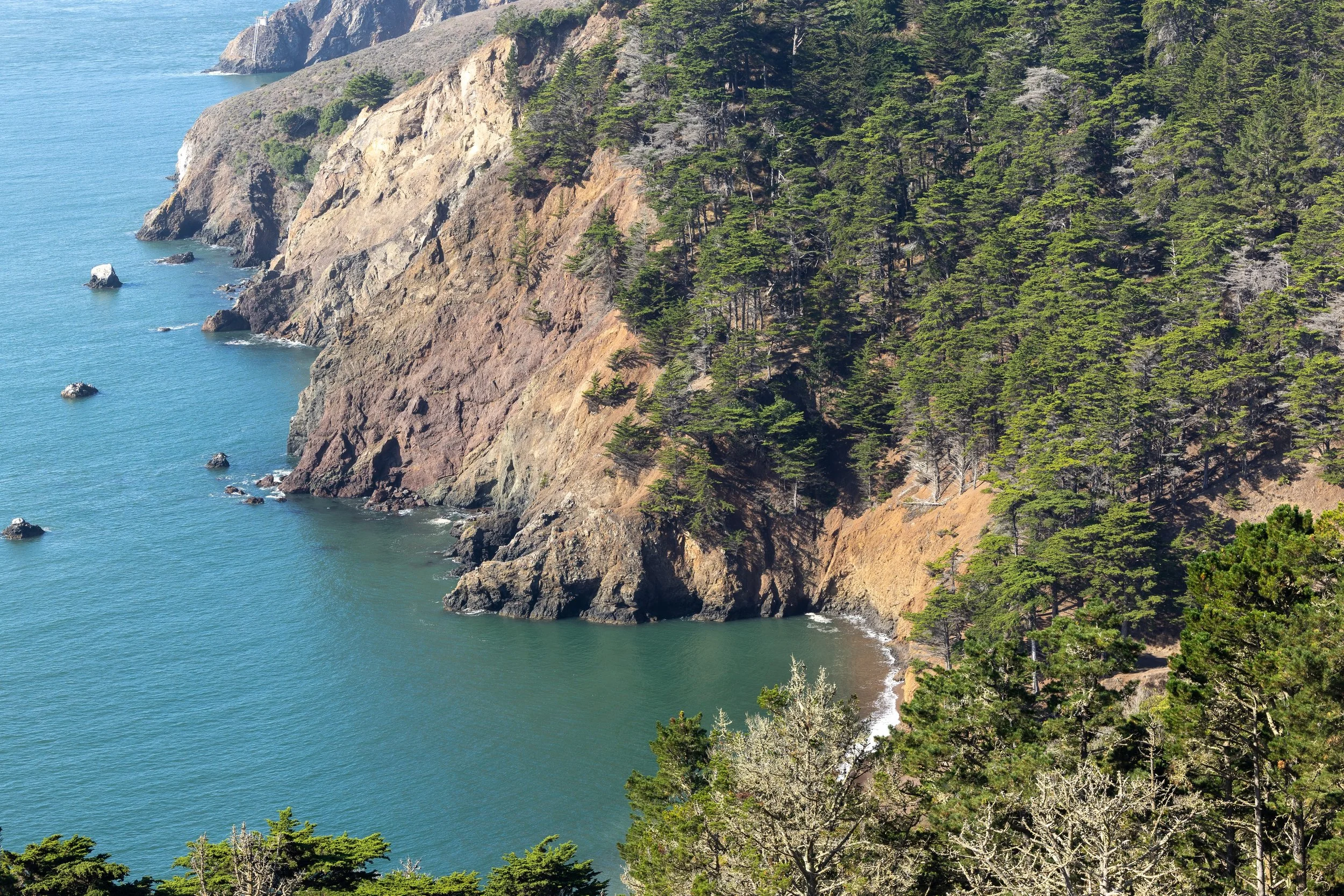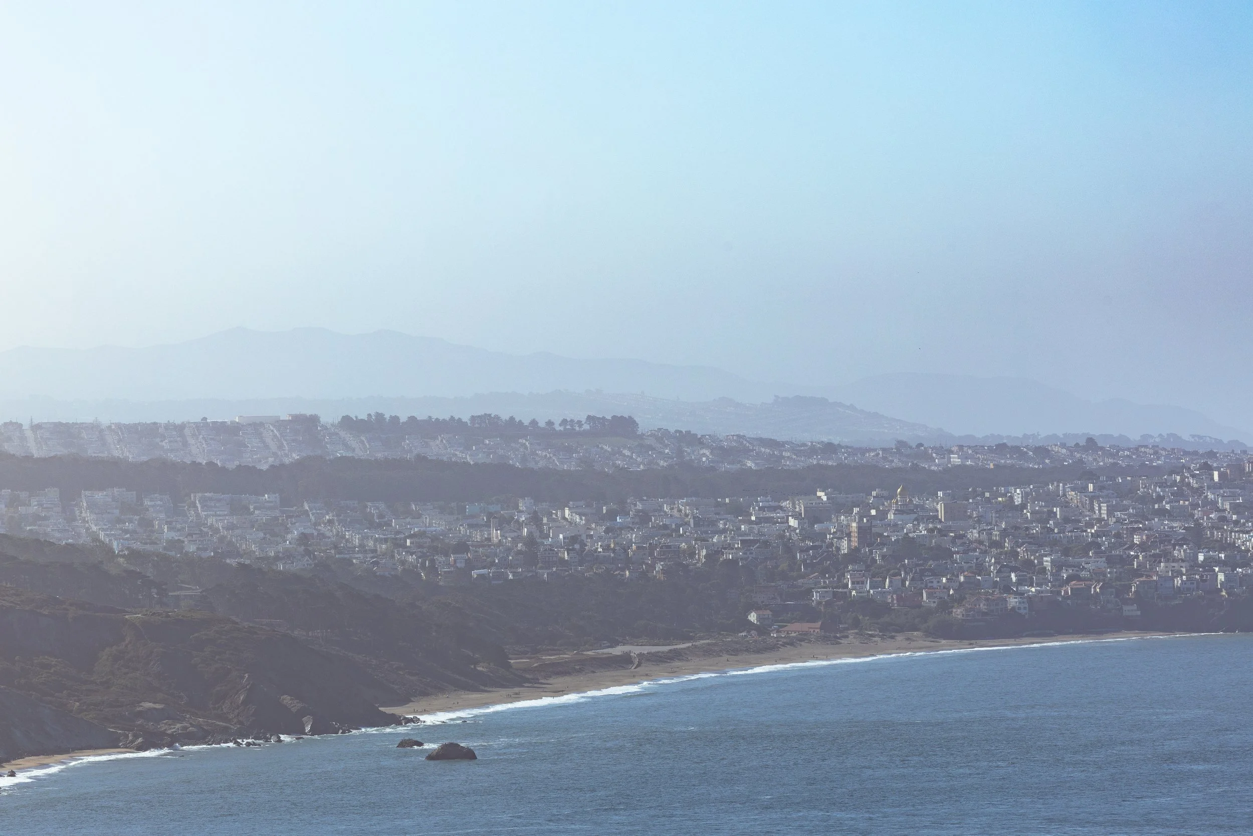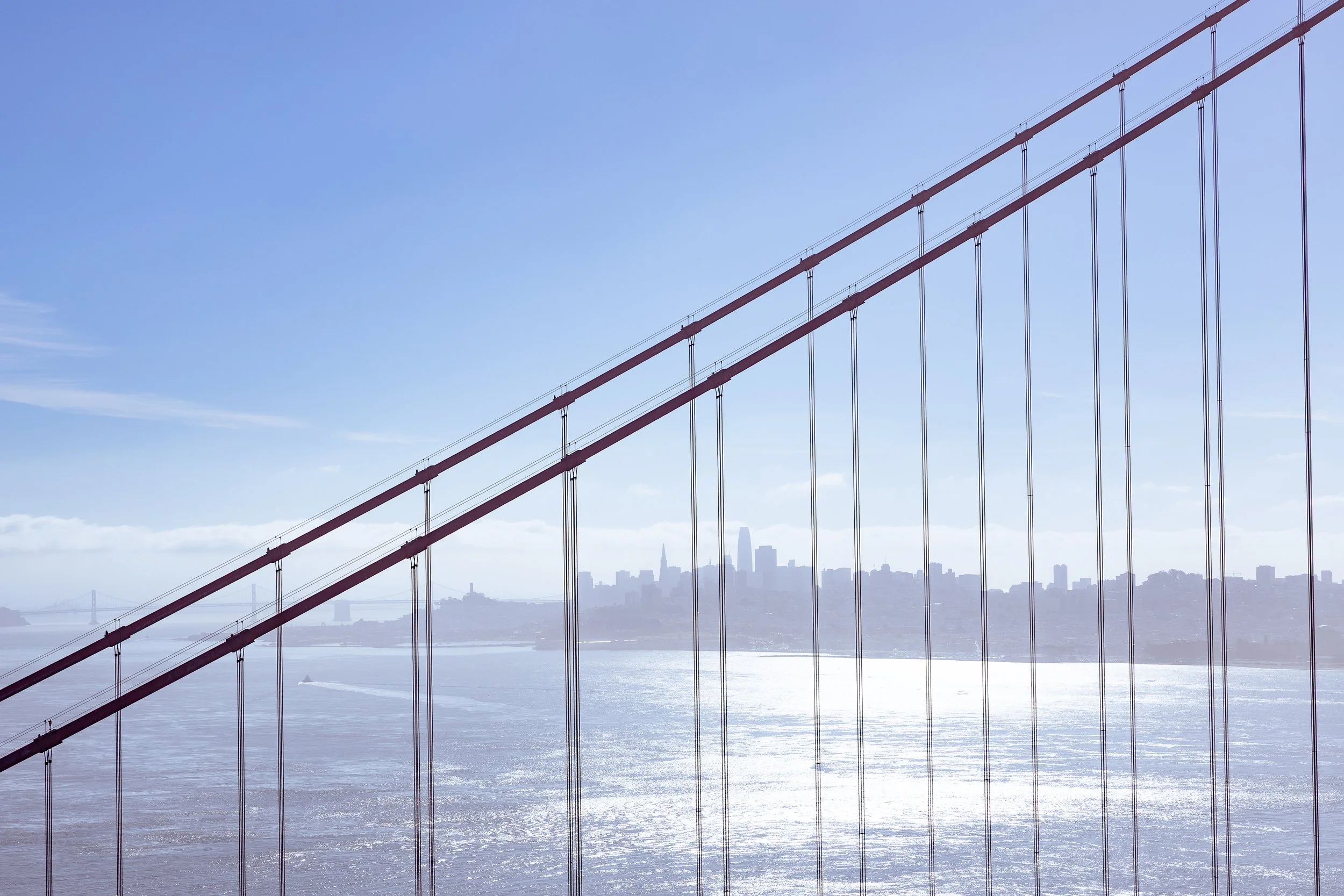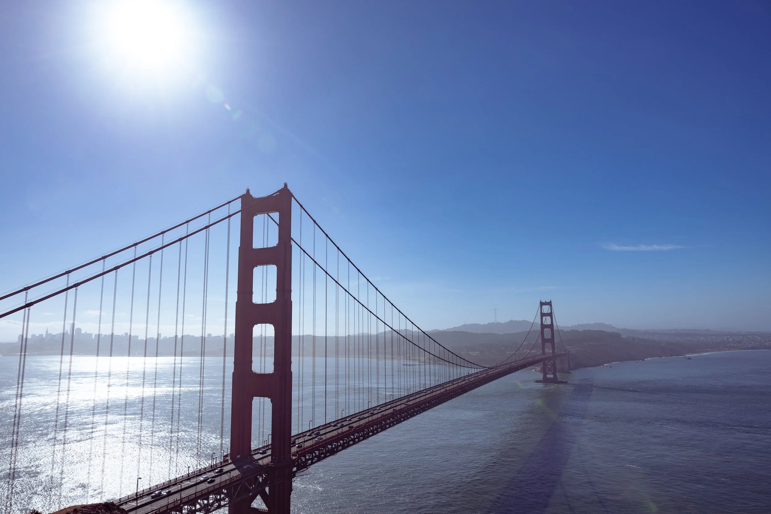 Bathed in brighter, revealing light, this collection focuses on the sweeping panoramic rewards found at the summit of Battery Spencer. The photos juxtapose the rugged, tree-lined cliffs of the coast with the precise, industrial geometry of the bridge’s suspension cables and art deco towers. It captures the clarity of the scene, from the sun flare bursting over the red steel to the distant, shimmering grid of the San Francisco skyline and the intimate details of love locks fastened to the overlook fence.