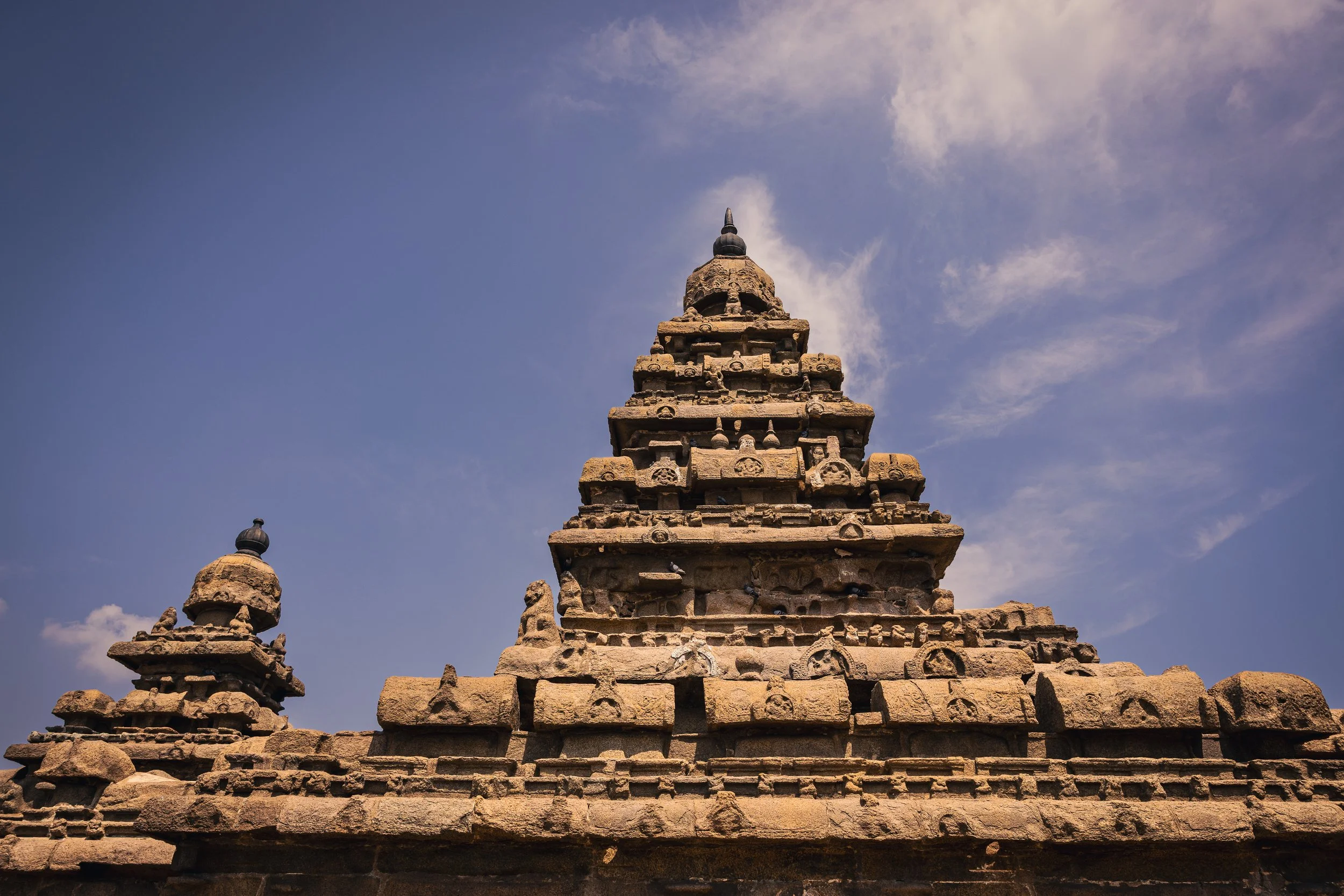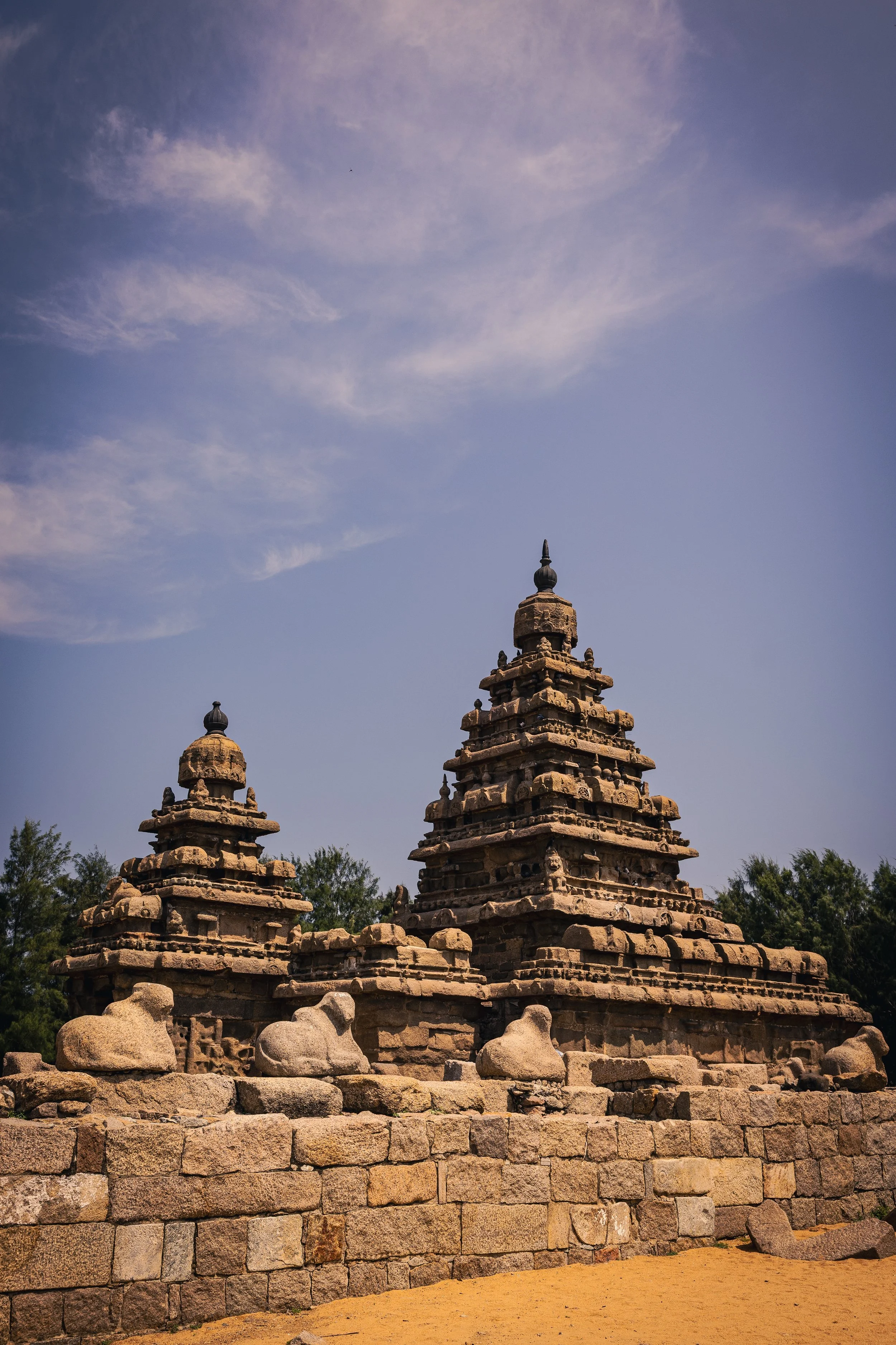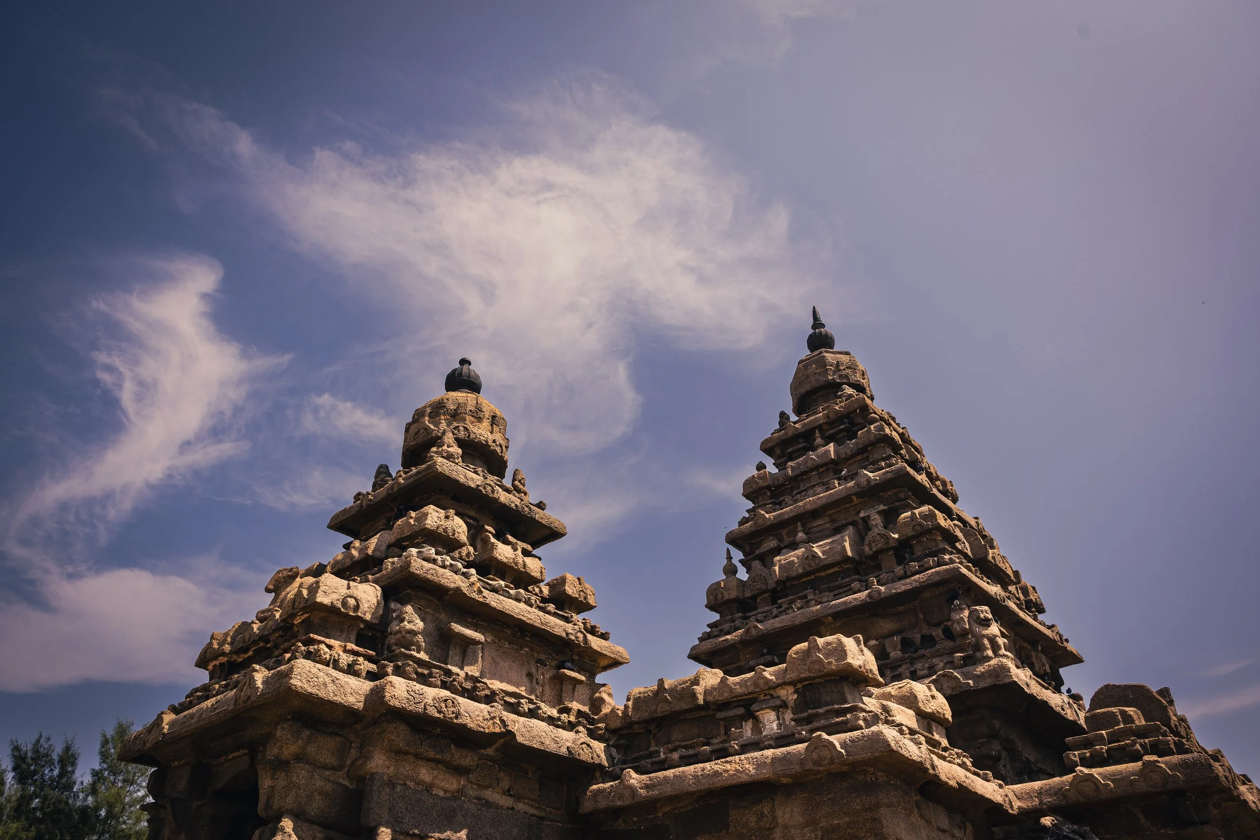 This collection emphasizes the vertical grandeur of the Shore Temple, tracing the intricate, stepped tiers of the Dravidian vimanas (towers) as they reach toward the heavens. The images capture the architectural rhythm of the pyramidal structures, from the weathered rows of Nandi bulls anchoring the base to the pointed stupis (finials) piercing the skyline. By framing the ancient granite spires against the vastness of the clouds, the album highlights the spiritual and structural ambition of this Pallava masterpiece.