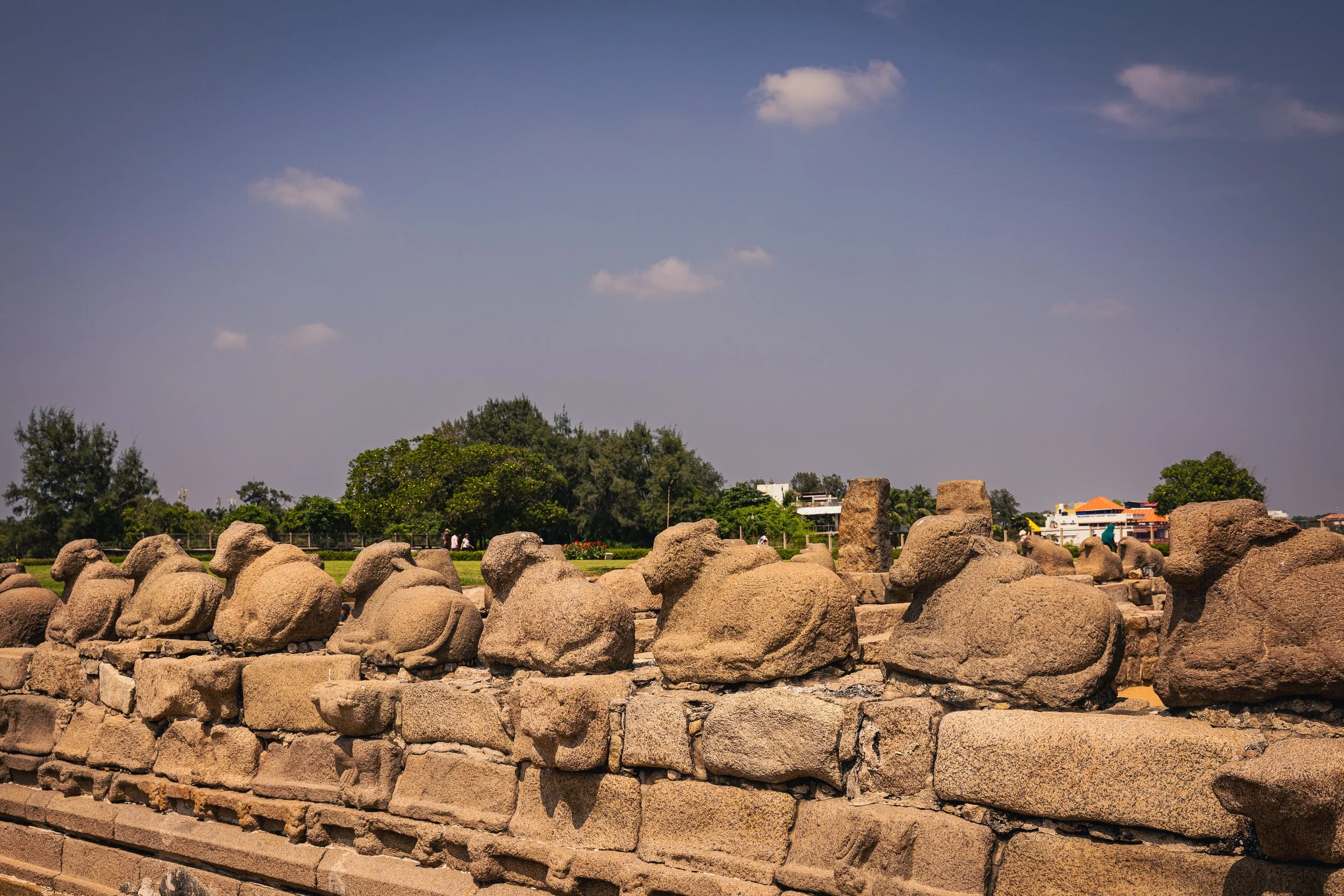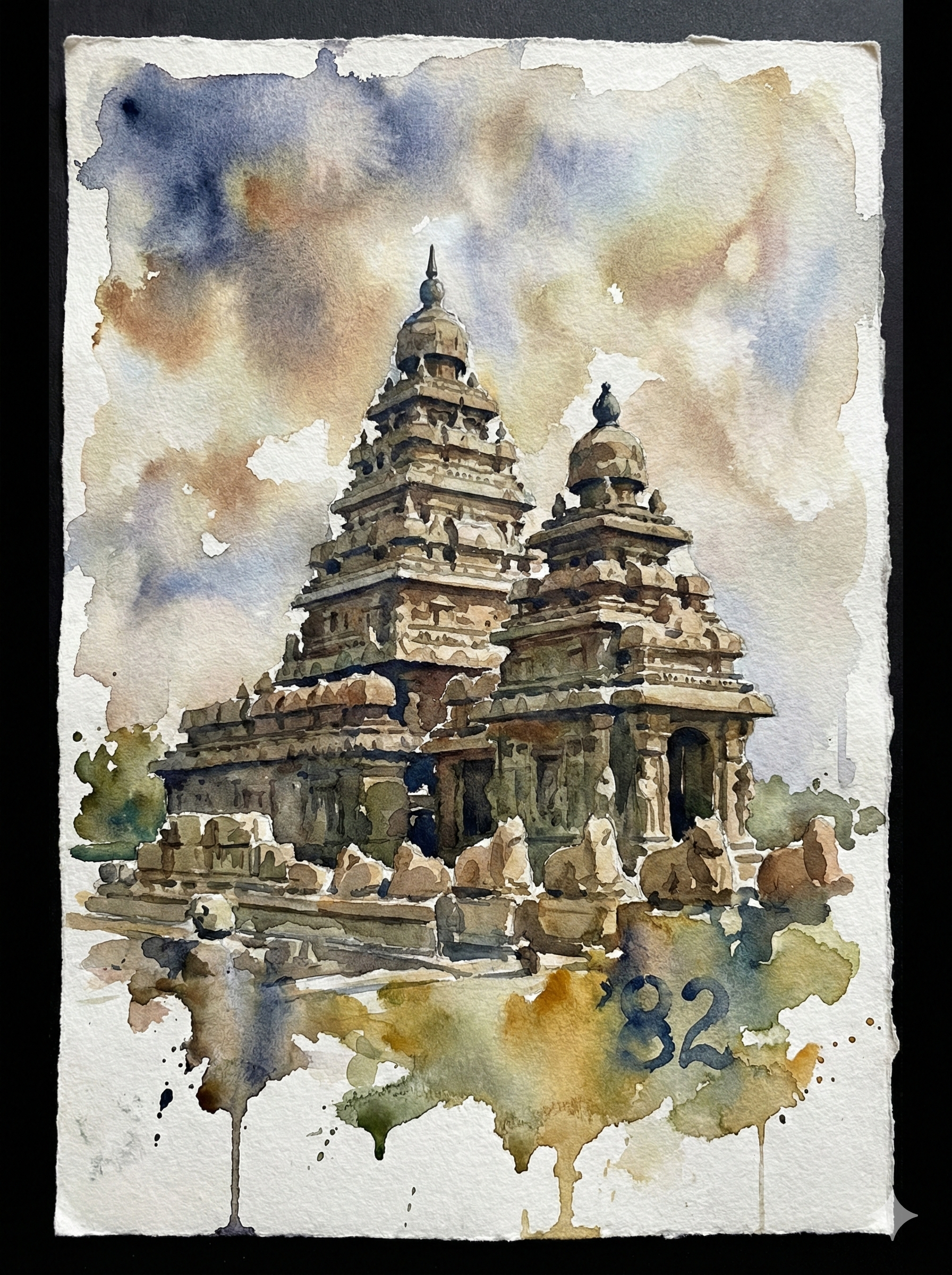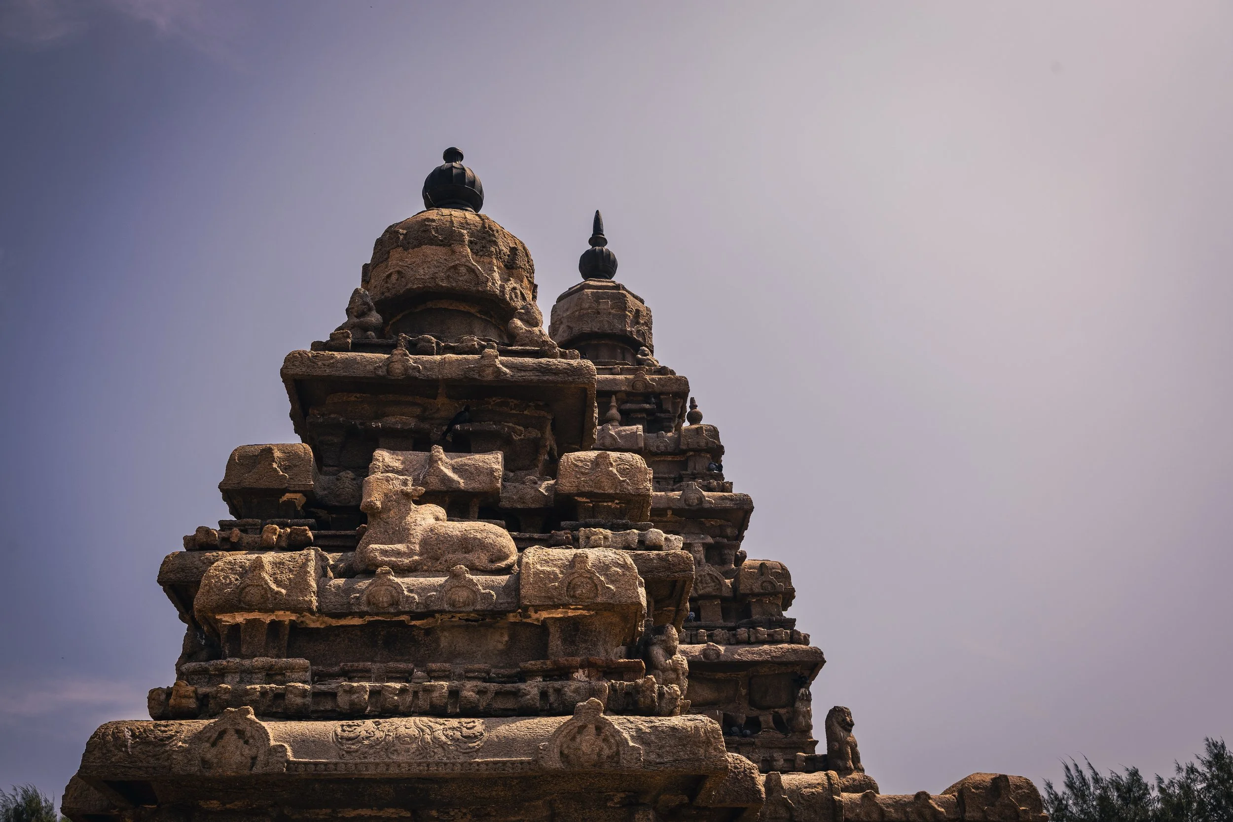 This collection emphasizes the vertical grandeur of the Shore Temple, tracing the intricate, stepped tiers of the Dravidian vimanas (towers) as they reach toward the heavens. The images capture the architectural rhythm of the pyramidal structures, from the weathered rows of Nandi bulls anchoring the base to the pointed stupis (finials) piercing the skyline. By framing the ancient granite spires against the vastness of the clouds, the album highlights the spiritual and structural ambition of this Pallava masterpiece.